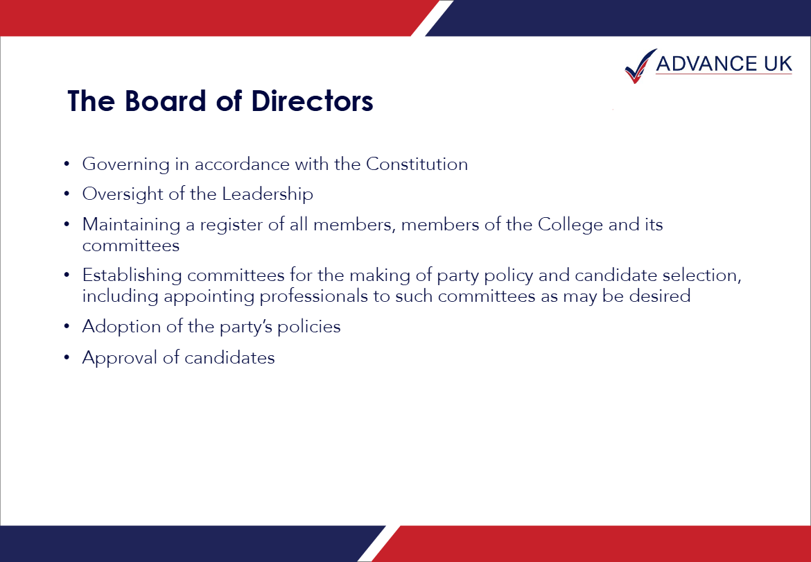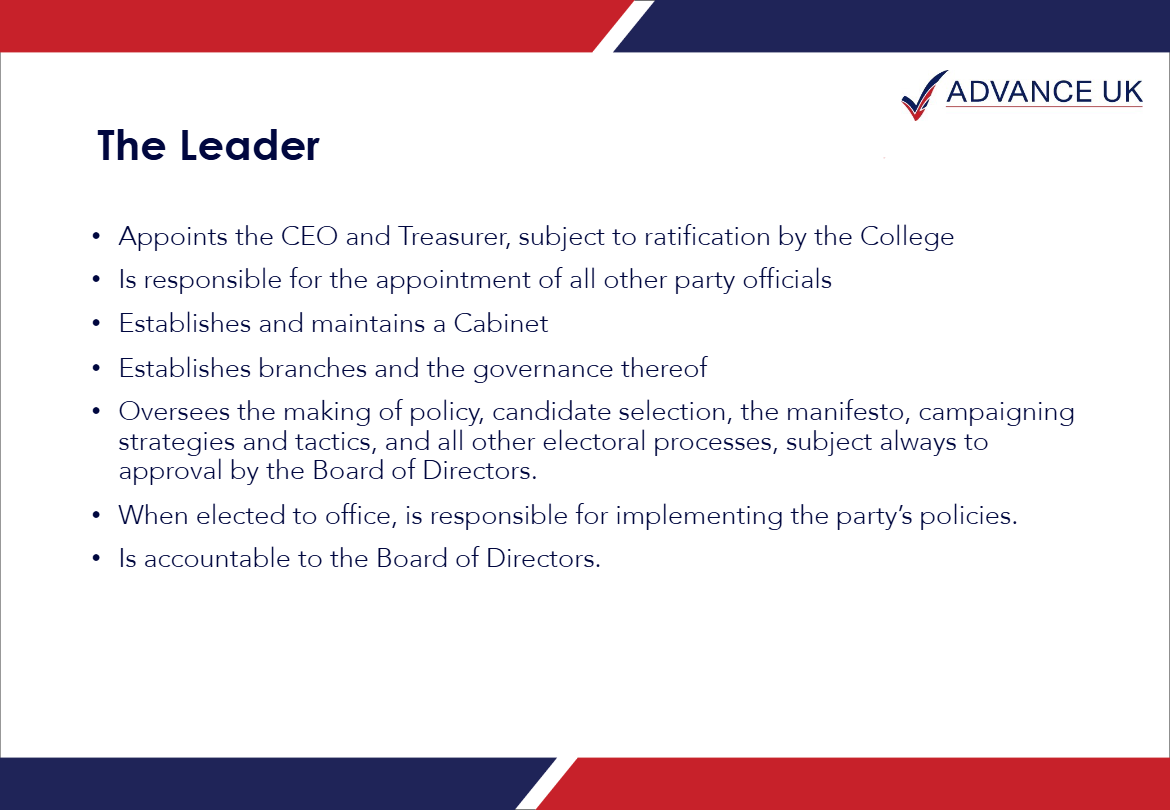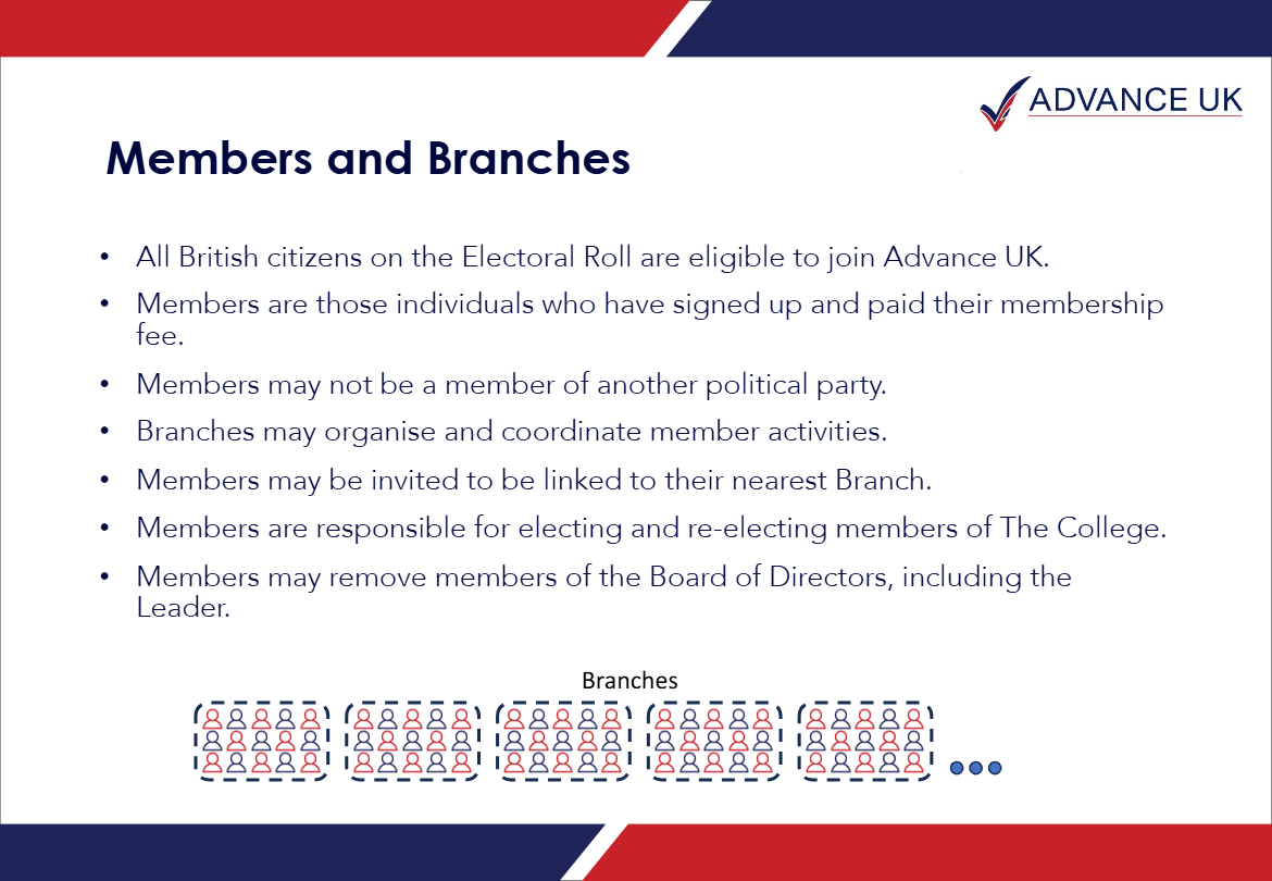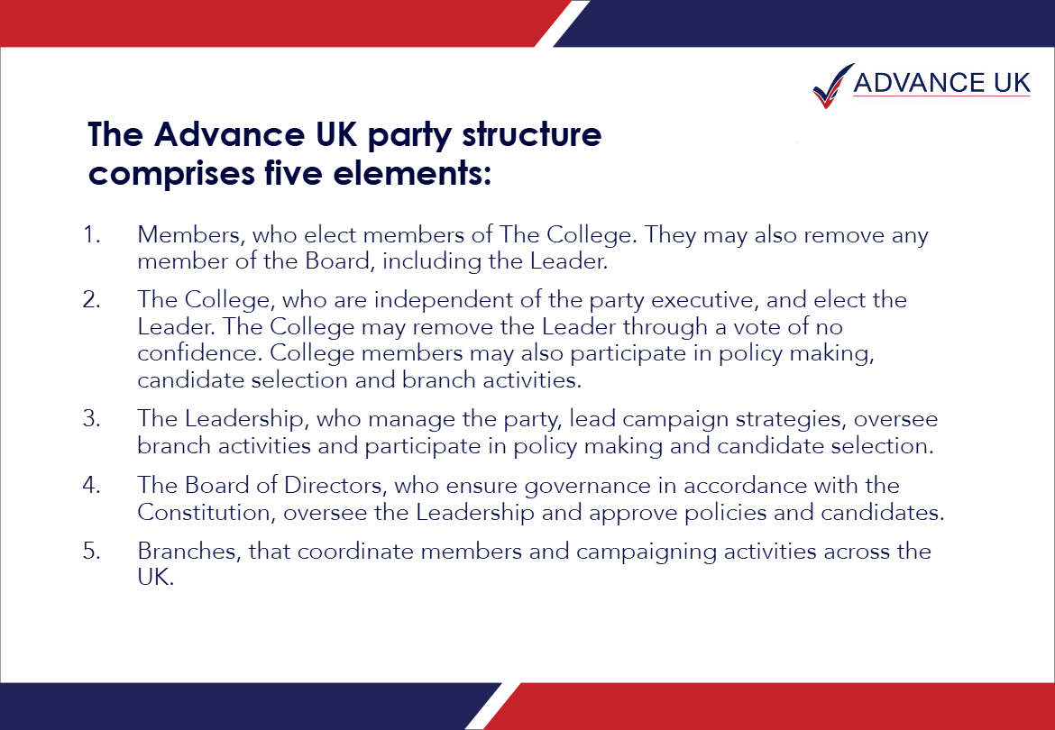 Advance UK isn’t just another political party — it’s a democratic revolution. This video reveals how Advance UK is structured from the ground up to give real power back to the British people. Membership is open to anyone who is a British citizen, on the electoral roll, and not part of another political party. That’s it. No loyalty tests. No gag orders. No policing your views. You can speak freely and think for yourself — exactly as it should be in a democracy. Advance UK’s structure includes three bodies: the membership, the college (the intellectual and constitutional heart of the party), and the executive. At the top sits a board of directors accountable to the members. You, the people, choose the leaders — and you can sack them, too. That’s how democracy works. If you believe in free speech, democratic accountability, and a truly member-led movement, this is the party that stands with you.